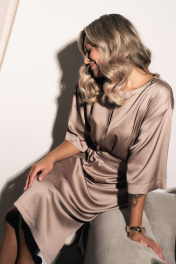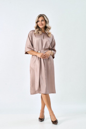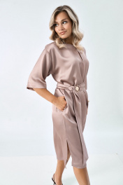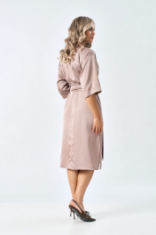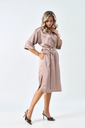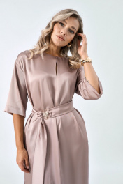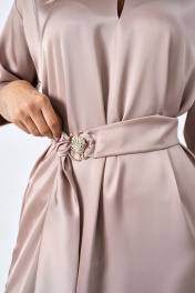 Нарядное женское платье выполнено из плательной ткани. Горловина округлой формы с декоративным разрезом. По переду изделия средний шов. Платье со спущенным рукавом. Рукав на манжете, длина ¾. Спинка со средним швом с застежка на потайную молнию. В боковых швах изделия есть карманы, по низу выполнены разрезы. Изделие с поясом из основной ткани с декоративной пряжкой.