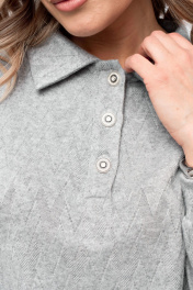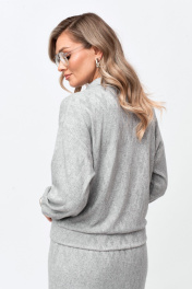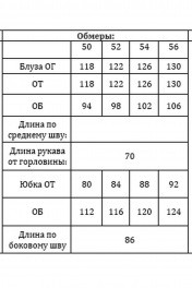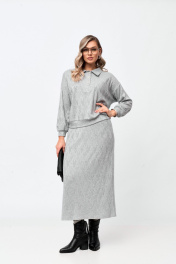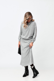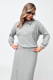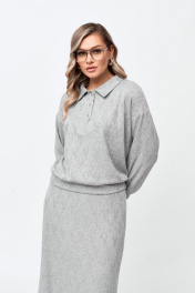 Трикотажный комплект состоящий из блузы-поло и юбки. Блуза-поло свободного силуэта, со спущенным длинным рукавом на манжете. Горловина с воротником и застежкой на петли пуговицы. По низу блузы есть планка из основной ткани. Юбка длинная полуоблигающего силуэта, слегка расширенная к низу. Юбка с цельным поясом на резинке, есть трикотажная подкладка.