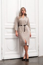 Платье полуприлегающего силуэта слегка зауженное к низу, выполнено из мягкой и качественной ткани Рукав втачной ¾. на манжете. Горловина V -образная с воротником на стойке. По переднему полотнищу карманы и разрез по низу среднего шва. По спинке изделия средний шов. В комплекте с изделием идет пояс.