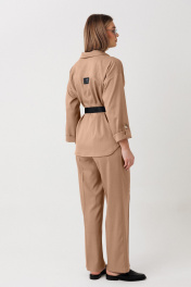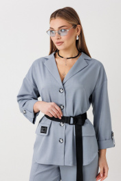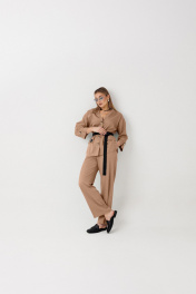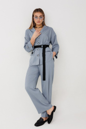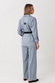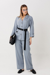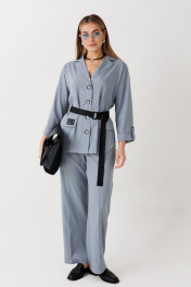 Комплект двойка состоит из жакета, и брюк. Жакет свободного кроя. Рукав спущенный, свободного кроя с манжетой на пату. По переду застежка на петли пуговицы и декоративные клапаны. Брюки классические, прямые, карманы в боковых швах. Брюки на поясе с резинкой. В комплекте декоративный пояс.