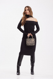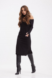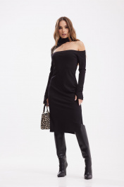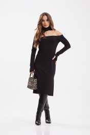 Платье прилегающего силуэта из трикотажного полотна. Воротник стойка. Застежка в среднем шве спинки на потайную молнию. Слева разрез 29см. Рукав длинный с отверстием для большого пальца. По переду вырез асимметричной формы с открытым левым плечом.