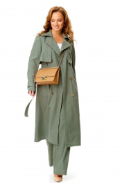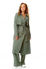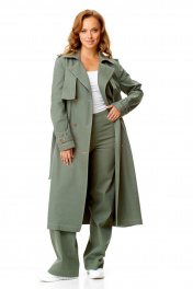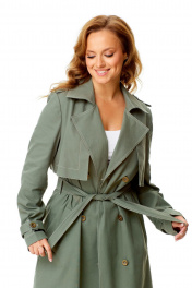 Тренч свободного покроя. Спинка со средним швом и высокой шлицей. По переду выполнены прорезные карманы с листочкой. Центральная двубортная застёжка на петли-пуговицы. На спинке и переде выполнены отлетные кокетки с отделочными строчками контрастного цвета. Для поддержания навесного пояса настрочены декоративные шлевки. Воротник отложной пиджачного типа с отрезной стойкой. Рукав втачной двухшовный с хлястиками и шлевками по низу рукава. На плечах выполнены паты со шлевками. имеется навесной пояс с декоративной пряжкой.