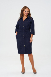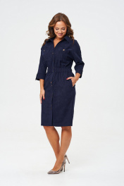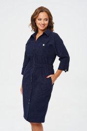 Платье женское полуприлегающего силуэта, заужено к низу. Рукав цельнокроеный типа "летучая мышь" длиной 3/4. Низ рукава с манжетой и патой. Горловина обработана блузочным воротником на отрезной стойке. Перед с планкой и застежкой на петли-пуговицы. По переду настрочены нагрудные карманы со встречной складкой. Перед и спинка с отрезными кокетками. В боковых швах карманы. Для придания силуэтности платью, по линии талии настрочена кулиса с резинкой.