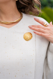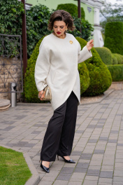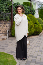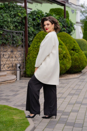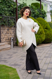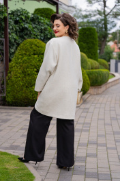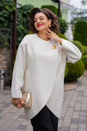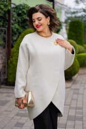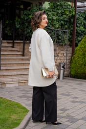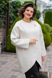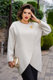 Пальто свободного покроя с лёгким заужением к низу и со спущенной линией плеча.Подкладка с синтепоном, что придает дополнительный комфорт в прохладную погоду. Спинка со средним швом.По переду имеются прорезные карманы с листочкой.Борта закруглённой формы.Застежка двубортная на пришивные кнопки.Верхняя пуговица авторской формы.