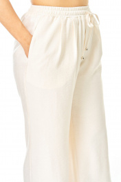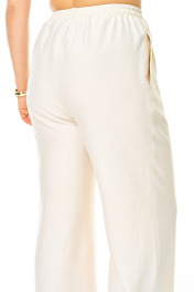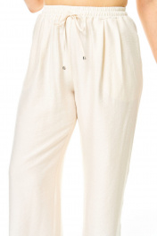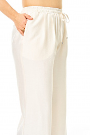 Костюм женский состоит из жакета и брюк. Жакет прямого свободного покроя со спущенной линией плеча.По переду обработана настрочная планка.Застежка центральная бортовая на золотые кнопки.По спинке и переду обработана отрезная баска контрастного цвета.Воротник блузочный отложной.Рукав длинной 3/4.По низу рукава обработана отрезная манжета контрастного цвета.По переду имеются накладные карманы с бантовыми складками и клапанами.Брюки свободные прямого силуэта.На передних половинках выполнены по две односторонние складки.Пояс притачной на резинке с втянутым шнуром.В боковых швах карманы.Вся фурнитура металлическая premium качества.