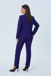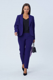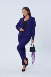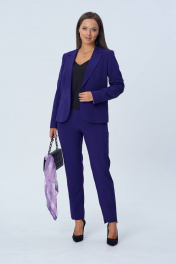 Костюм женский двухпредметный, состоящий из жакета и брюк. Жакет полуприлегающего силуэта с центральной бортовой застёжкой на одну петлю-пуговицу до линии перегиба лацкана. Перед с талиевой вытачкой и прорезным карманом с листочкой с втачными концами. Спинка со средним швом. Рукав втачной двухшовный длинный. Воротник пиджачного типа. Брюки классического кроя, слегка зауженные к низу с притачным поясом с резинкой по задним половинкам брюк. Брюки с наклонным к боковому шву карманом и двумя фигурными хлестиками на одну пуговицу по поясу передних половинок. Застёжка на тесьму - молнию и одну петлю-пуговицу по поясу. Низ брюк имеет фигурную форму - укорочена по передним половинкам и удлинённые по задним. Длина жакета по спинке - 59 см. Длина рукава - 61 см. Длина брюк по боковому шву - 96 см.