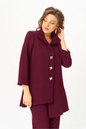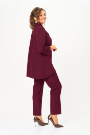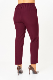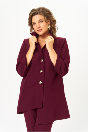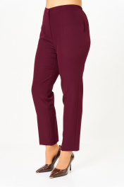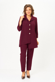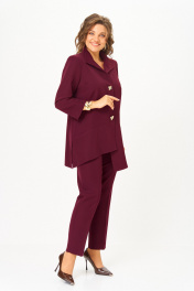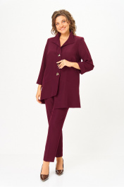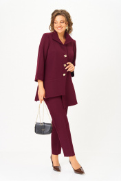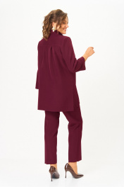 Комплект женский, состоящий из туники и брюк. Туника А-образного силуэта с центральной застежкой на планку до подреза на 3 декоративные петли-пуговицы. Перед с нагрудной вытачкой и фигурными подрезами. Спинка с горизонтальной кокеткой и двумя складками. В боковых швах обработаны разрезы. Низ переда ассиметричен и слегка разведен. Рукава втачные одношовные длиной 3/4 с защипом, имитирующим манжет. Воротник-стойка. Брюки классического кроя, зауженные к низу с притачным поясом сзади на резинке. Застежка на тесьму-молнию в среднем шве передних половинок и 1 петлю-пуговицу по поясу. На брюках заутюжены канты.