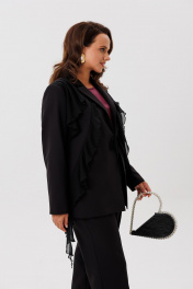 Костюм женский трехпредметный, состоящий из жакета, блузки и брюк. Жакет полуприлегающего силуэта, скомбинированный из двух видов ткани с центральной бортовой застежкой встык на завязки с фигурным подрезом из горловины и до бокового шва. Жакет с ассиметричными вставками из шифона в виде воланов. По правой части переда шифон с 3 складками вставлен по плечевому шву, частично по горловине и ниспадает из пройм. Второй волан вставлен в рельефный подрез, имеет разную ширину и не доходя до бокового шва ниспадает сходя на нет шлейфом. По левой части переда шифоновый волан фигурной формы вставлен в плечевой шов, горловину, и ниспадает на нет. Спинка со средним швом. Рукав втачной длинный двухшовный. Брюки классического кроя, прямые, с заутюженными кантами, с притачным поясом сзади на резинке и боковыми карманами с отрезным бочком. Застежка на тесьму-молнию в средних срезах передних половинок брюк.