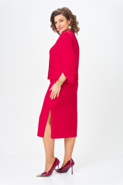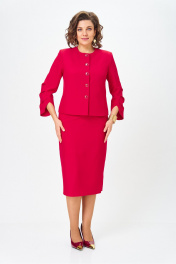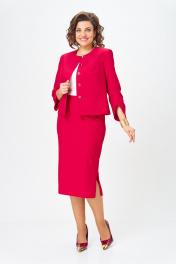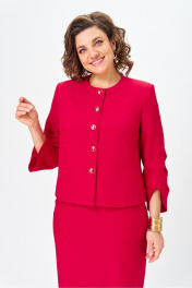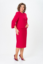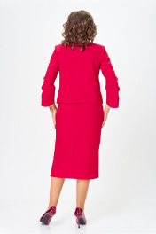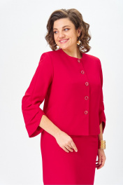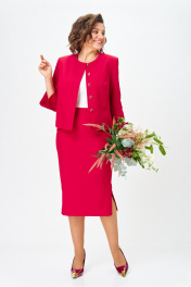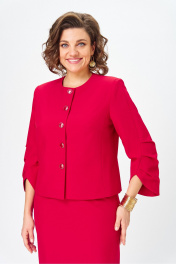 Костюм женский двухпредметный, состоящий из жакета и юбки. Жакет укороченный, на подкладке, с центральной бортовой застежкой на 5 петель-пуговиц. Перед с отрезным бочком и нагрудной вытачкой. Спинка со средним швом. Горловина овальной формы. Рукава 3-шовные с тремя складками по среднему шву рукава и фигурнооформленным низом, укороченные. Воротник объемный декоративный, с кружевом и бусинами. Юбка зауженная к низу длиной за колено с притачным поясом. На участках от вытачки переднего полотнища до вытачки заднего полотнища вставлена эластичная тесьма-резинка. В боковом шве по низу изделия обработана потайная тесьма-молния, для эффекта - разрез. Застежка в среднем шве заднего полотнища на петлю-пуговицу и потайную тесьму-молнию.