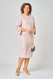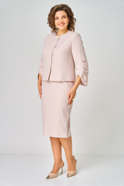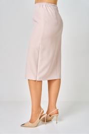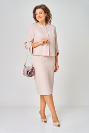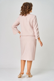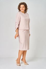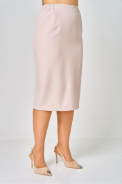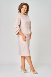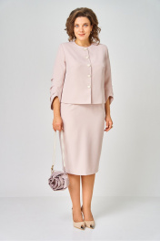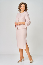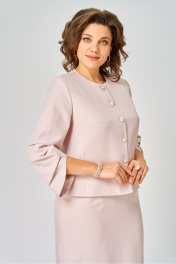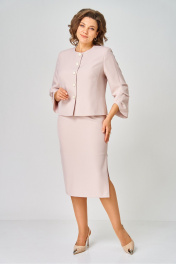 Костюм женский двухпредметный, состоящий из жакета и юбки. Жакет укороченный, на подкладке, с центральной бортовой застежкой на 5 петель-пуговиц. Перед с отрезным бочком и нагрудной вытачкой. Спинка со средним швом. Горловина овальной формы. Рукава 3-шовные с тремя складками по среднему шву рукава и фигурнооформленным низом, укороченные. Воротник объемный декоративный, с кружевом и бусинами. Юбка зауженная к низу длиной за колено с притачным поясом. На участках от вытачки переднего полотнища до вытачки заднего полотнища вставлена эластичная тесьма-резинка. В боковом шве по низу изделия обработана потайная тесьма-молния, для эффекта - разрез. Застежка в среднем шве заднего полотнища на петлю-пуговицу и потайную тесьму-молнию.