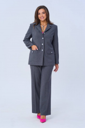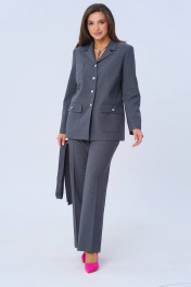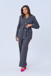 Костюм женский двухпредметный, состоящий из жакета и брюк. Жакет полуприлегающего силуэта на подкладке с центральной бортовой застёжкой на 4 петли-пуговицы до перегиба лацкана. Детали переда с нагрудной вытачкой, выходящей из бокового шва и накладными карманами с клапаном и одной вертикальной петлёй с пуговицей. На правой детали переда обработан накладной карман. Спинка со средним швом. Рукава втачные двухшовные. Воротник пиджачного типа. Имеется съёмный пояс. По краю борта воротника, лацканов, клапанов, пояса и среднего шва спинки проложена отделочная строчка на 0,5 см. от края. Брюки классического кроя с притачным поясом на резинке по задним половинкам и с застёжкой на тесьму-молнию в средних срезах передних половинок брюк и 1 петлю- пуговицу по поясу. В брюках заутюжены канты и обработаны наклонные к боковому шву карманы. Длина жакета по спинке - 69 см. Длина рукава - 61 см. Длина брюк по центру передней половинки - 105 см.
