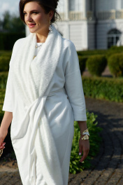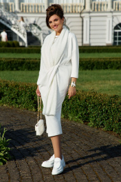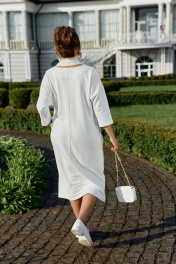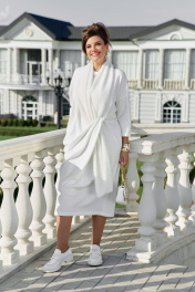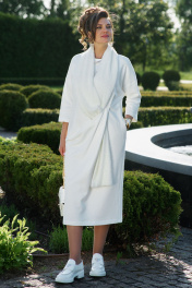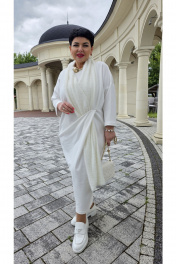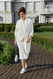 Если Вы ищете идеальное сочетание стиля и комфорта, вот идеальный выбор. Мы специально подобрали качественную и тактильно приятную ткань, которая хорошо держит свою форму, создавая ощущение легкости и свободы движения. Платье свободного силуэта, слегка заужается к низу, с округлой формой горловины, линия плеча спущенная. Главная интрига кроется в декоративной складке в подрезе по переду. Это тщательно продуманный декоративный элемент. Эта складка — свидетельство высокого искусства кройки; она добавляет глубину и динамику лаконичному фасону, создавая иллюзию движения даже в неподвижности. Спинка в платье со средним швом. Рукав в платье втачной, длиной 7/8. Но кульминацией образа становится отдельный декоративный элемент. Шарф, идущий в комплекте, драпируется на шее, являясь частью наряда. Он создаёт завершающий образ.Вместе с платьем они создают диалог текстуры и формы, тем самым завершая образ. Гладкое, платье служит идеальным холстом для струящейся драпировки шарфа. Длина платья 116 см (р.52-56), 117 см (р.58-62), длина рукава 31 см (р.52-56), 30 см (р.58-62).