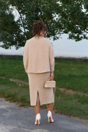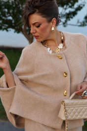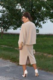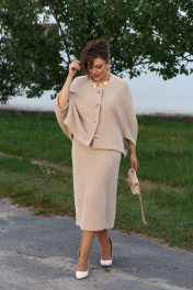 Комплект женский состоящий из жакета и платья. Жакет «оверсайз» свободного силуэта, с центральной застёжкой на потайные кнопки по краю борта. Горловина в жакете округлой формы с прилегающим воротником-стойкой. Рукав по форме летучая-мышь с фигурной линией низа. По переду платья рельеф уходящий в рукав. Спинка со средним швом. Боковые швы жакета переходят на перёд. В качестве дополнительного декоративного элемента по краю борта жакета декоративные украшения в виде брошек. Платье полуприлегающего силуэта с округлой формой горловины. Рукав в платье втачной, короткий. По спинке средний шов заканчивающийся разрезом. Длина платья от высшей точки плечевого шва до низа 120 см (р 50-54), 120,5 см (р 56-60). Длина по спинке жакета 64 см (р 50-54), 65 см (р 56-60). Длина рукава жакета 59,5 см (р 50-54), 61 см (р 56-60)