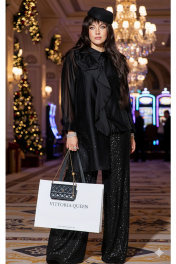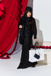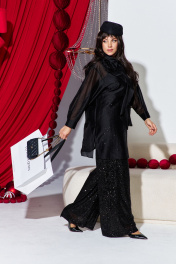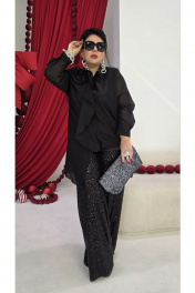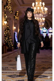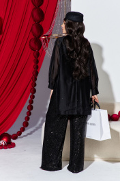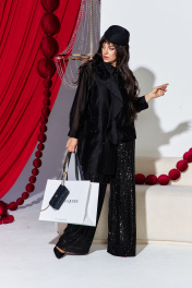 Комплект женский брючный, состоящий из блузки, блузы и брюк. Это нарядный и стильный комплект, который идеально подходит для вечернего мероприятия. Брюки выполнены из плотной ткани, полностью расшитой чёрными пайетками, которые создают эффект яркого мерцания при движении. Их свободный крой и высокая посадка на талии обеспечивают комфорт и создают современный, элегантный силуэт. Блузка из полупрозрачной чёрной вуали имеет свободный, струящийся крой. Её главным акцентом является крупный объёмный цветок, расположенный на плече, и декоративная драпировка. Под блузкой надет топ чёрного цвета, который скрывает тело и придаёт образу завершённость. Блузка (состав: 83% вискоза, 17% полиэстер) свободного силуэта, с центральной застёжкой на петли-пуговицы по планке, воротником рубашечного типа. Линия плеча в блузке спущенная. Рукав втачной, длинный с заложенной складкой по низу и притачной манжетой, застёгивающейся на петли-пуговицы. Спинка с отрезной кокеткой. Низа в блузке ассиметричный, в боковом шве высокий разрез. Главным акцентом является декоративный элемент в виде розы. Блуза (состав: 97% полиэстер, 3 % спандекс) прямого силуэта с округлой формой горловины и нагрудными вытачками по полочке. В боковых швах разрезы. Брюки (состав: 97% ПЭ, 3% спандекс, подкладка 100% полиэстер) прямого силуэта, пояс цельнокроенный, на эластичной тесьме-резинке. Брюки на подкладке. Длина блузки по спинке 92 см, длина по переду (слева) 66 см (р 48-52), 67 см (р 54-58), длина рукава 52 см. Длина блузы по спинке 65 см, длина плеча 8,5 см. Длина брюк 109 см. Блузка 48 50 52 54 56 58 обхват груди 118 122 126 130 134 138 обхват бедер 120 124 128 132 136 140 ширина рукава вверху 48 50 52 52 54 56 Блуза 48 50 52 54 56 58 обхват груди 108 112 116 120 124 128 ширина по низу 116 120 124 128 132 136 Брюки 48 50 52 54 56 58 обхват талии 74/106 78/110 82/114 86/118 90/122 94/126 обхват бедер 110 114 118 122 126 130
