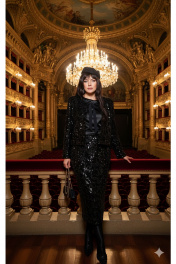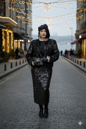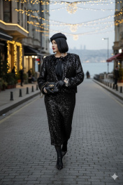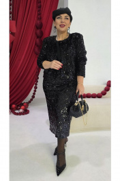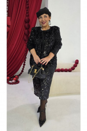 Общий образ — минимализм цвета и максимальная выразительность текстур. Материалы будто говорят на языке контраста: атласный блеск в блузе гармонично сочетается с зеркальной, перламутровой игрой пайетки. Этот комплект создает ощущение современной роскоши для вечерних выходов, деловых мероприятий и торжественных приемов, где ценят изящество без лишних деталей, спокойную уверенность и плавное движение света. Комплект женский, трёх-предметный, состоящий из жакета, блузы и юбки.Жакет (состав: 100% полиэстер, подкладка 100% полиэстер) укороченный, свободного силуэта, без застёжки, с акцентом на ровную линию плеч. Головина округлой формы с прилегающей стойкой из отделочной ткани, переходящей в декоративные ленты, завязывающиеся на бант. Спинка без особенностей. Рукав втачной, длинный. Жакет на подкладке.Блуза (состав: 97% полиэстер, 3 % спандекс) в классическом чёрном оттенке, который гармонично сочетается с насыщенным чёрным цветом комплекта. Блуза прямого силуэта с округлой формой горловины и нагрудными вытачками по полочке. Спинка без особенностей. Низ в блузе фигурной формы.Юбка (состав: 100% полиэстер, подкладка 100% полиэстер) длиной миди держит внимание за счет ткани, украшеной в густую, слегка крупную фактурную пайетку. Юбка прямого силуэта с притачным поясом со вставкой эластичной тесьмы-резинки в бочках. В среднем шве заднего полотнища юбки застёжка на молнию и пуговицу в поясе.Длина жакета по спинке 60 см, длина рукава 60 см. Длина блузы по спинке 65 см, длина плеча 14 см (р 50-54), 14,5 см (р 56-60). Длина юбки 79,5 см. Жакет 50 52 54 56 58 60 ширина на уровне проймы 112 116 120 124 128 132 ширина по низу 116 120 124 128 132 136 Блуза 50 52 54 56 58 60 ширина на уровне проймы 112 116 120 124 128 132 ширина по низу 116 120 124 128 132 136 Юбка 50 52 54 56 58 60 ширина по талии 80/94 84/98 88/102 92/106 96/110 100/114 обхват бедер 118 122 126 130 134 138 ширина пояса 4 4 4 4 4 4