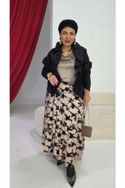 - ОписаниеЖенский комплект состоит из трёх элементов, каждый из которых дополняет другой, создавая гармоничную и современную образность. Жакет (состав: 55% хлопок, 40% полиамид, 5% спандекс) - «оверсайз» силуэта, выглядит свободной на силуэте, её пространство вокруг плеч и линии талии напоминает мягкую волну одежды, которая свободно дышит и передаёт непринуждённую уверенность. Декоративные резинки с эффектом сборки вдоль рукавов, по деталям переда добавляют игривую динамику. Он будто приглушённый акцент в ансамбле — она подчёркивает силуэт сверху без утяжеления, оставляя место для свободной игры ткани. Блуза (состав: 100% полиэстер) в нежном бежевом оттенке, который гармонично сочетается с насыщенным чёрным цветом комплекта. Блуза прямого силуэта с округлой формой горловины и нагрудными вытачками по полочке. Спинка без особенностей. Низ в блузе фигурной формы.Юбка (состав: 50% район, 50% вискоза, подкладка 100% полиэстер) баллон из ткани с принтом, конической формы, расширяется к низу. Пояс в юбке притачной в виде декоративной эластичной тесьмы-резинки, а боковом шве застёжка на потайную тесьму-молнию. Юбка на подкладке. Длина спинки жакета 61 см, длина рукава 33 см. Длина блузки по спинке 63,5 см (р 48-52), 64 см (р 54-58), ширина плеча 8 см. Длина юбки 88 см (р 48-52), 89 см (р 54-58). Жакет 48 50 52 54 56 58 ширина на уровне проймы 120 120 120 132 132 132 ширина рукава вверху 44 44 44 51 51 51 Блуза 48 50 52 54 56 58 ширина на уровне проймы 102 106 110 114 118 122 обхват талии 101 105 109 113 117 121 Юбка 48 50 52 54 56 58 обхват талии 76/104 80/108 84/112 88/116 92/120 96/124 обхват бедер 140 144 148 152 156 160