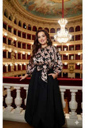 Невероятно красивое и элегантное платье отвечает всем требованиям вечернего наряда! Сочетание тканей разных фактур и дизайнов в одной модели - тренд сезона. Для лифа с мягкими присборенными рукавами мы выбрали пластичный атлас, а формоустойчивую тафту - для создания модной юбки «баллон». Сдержанный блеск атласа с деликатным принтом подчеркивает глубину тона черной тафты. Платье отрезное по талии, с круглой горловиной. Рукав длиной 7/8 со спущенной проймой и сборкой по низу на резинку. Длинная юбка «баллон» собирается по талии на эластичную ленту в отрезном поясе. По поясу платье декорировано бантом в виде съемной броши. Длина платья 129 см (р 48-52), 130 см (р 54-58). Длина рукава 31 см. Платье 48 50 52 54 56 58 обхват груди 117 121 125 129 133 137 обхват талии 76/103 80/107 84/111 88/115 92/119 96/123 обхват бедер 150 154 158 162 166 170