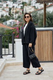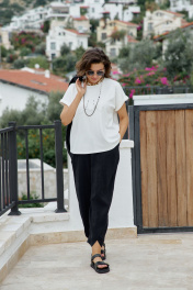 Брюки на резинке по всему поясу, что придаст вам комфорт в носке и не стеснит движений. В боковых швах карманы. К низу брюки заужены. По переду выполнены вертикальные рельефы с декоративным фигурным окончанием по линии низа. Брюки легко сочетаются с любым предметом вашего гардероба, вертикальные швы стройнят и вытягивают фигуру. Брюки незаменимы для прогулок, посиделок с друзьями, похода в кафе и отдыха. Модель свободного кроя органично впишется в гардероб, всегда будет элегантной и уместной, эта модель «вне времени» и будет актуальна в следующих сезонах. Брюки комфортны в носке на каждый день, создают женственный и элегантный образ. Мы используем материалы высокого качества, делаем акцент на фигуру и современный крой, что позволяет нашим изделиям не терять актуальности, а для вас служить выгодным приобретением. Длина брюк 99 см. Брюки 52 54 56 58 60 62 обхват талии 84/116 88/120 92/124 96/128 100/132 104/136 обхват бедер 127 131 135 139 143 147