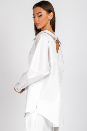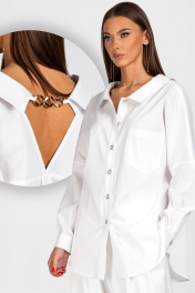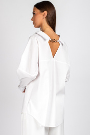 Блузка-рубашка прямого силуэта со спущенным плечом. Перед с центральной бортовой застежкой на 6 петель п пуговиц. На левой части переда настрочен карман. Спинка с кокеткой, бантовой складкой. Кокетка с V-образнымвырезом и цепочкой. Рубашка с отложным воротником. Рукав с манжетой на 1 петлю и пуговицу. Уход: бережная стирка при температуре не выше 30°С.