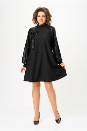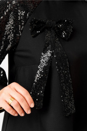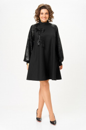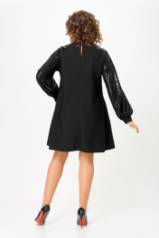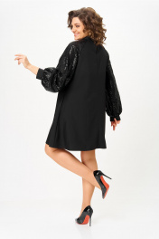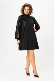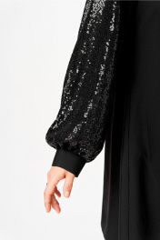 Платье: - свободный силуэт, - цельнокроенная горловина-стойка, - застежка петли-пуговицы по спинке, -рукав реглан, -низ рукава на манжете, -карманы в боковых швах, -по низу изделия отделочная строчка, - рукав втачной одношовный, - декоративное украшение съемный бант-пайетки "