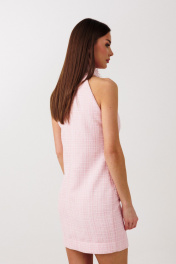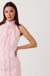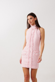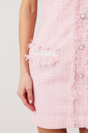 "Платье мини: - прилегающий силуэт, - воротник стойка с декоративной тесьмой, - планка с бахромой по передней части платья с пуговицами - застежка петли - пуговицы на воротнике по спинке, - потайная молния по спинке. - листочки с бахромой - на подкладке "