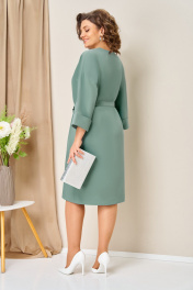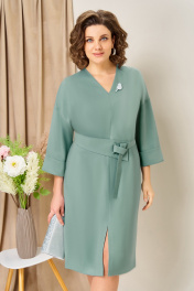 Элегантное лаконичное платье из облегченного текстиля полуприлегающего силуэта с акцентной V-образной горловиной. Центральный элемент отделки платья- вставки из кожи и необычная съемная брошь для легкости образа. Длина платья немного за колено, уместная в большинстве ситуаций. Спереди небольшой вырез для максимального удобства. Длина платья по центру спинки- 107см. Декоративный и функциональный пояс- в комплекте изделия.