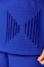 Современный женский костюм-двойка выполнен в глубоком кобальтовом синем оттенке, который выгодно подчеркивает любую цветовую палитру аксессуаров. Верх имеет округлый V‑образный вырез и декоративную планку с крупными обтянутыми пуговицами, слегка приталенный силуэт и 3/4 рукава для комфорта и универсальности. Оригинальная декоративная деталь в виде геометрической аппликации на бедре придает образу авторский акцент.На спинке нижняя отрезная часть застегивается на обтянутые пуговицы. Брюки прямого кроя, стандартной длины чуть выше щиколотки — создают стройный силуэт и удобны в носке. Костюм смотрится одновременно сдержанно и эффектно, подходит для офиса, встреч и праздничных мероприятий.